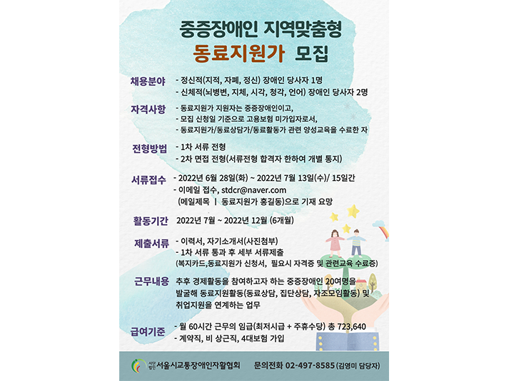 - 서울특별시 거주 중도 및 교통장애인 중 동료상담가로서 새로운 역량을 쌓고자 하는 의지가 있는 분