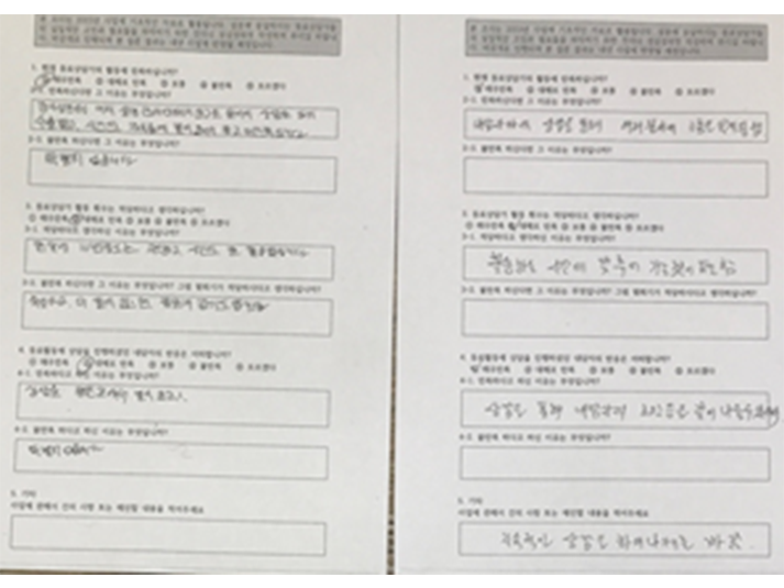 | 오리엔테이션 (06.13) | 동료상담가 양성교육 만족도 조사지 | 동료상담가 활동사진 | 동료상담가 활동사진 |