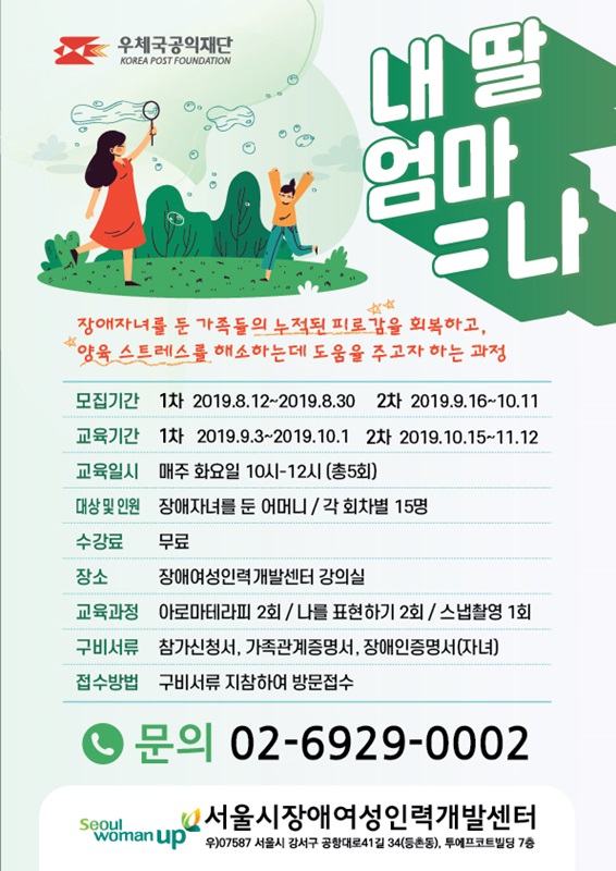 '내 딸 엄마=나' 교육 과정은 장애자녀를 둔 어머니들의 양육스트레스를 조금이나마 해소하기 위한 강좌입니다. 부모이기에 견뎌야 하는 어머님들에게 잠깐의 쉼을 드리고 싶습니다.