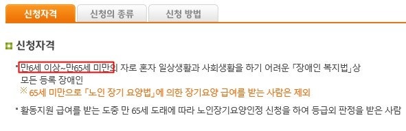 현재 장애인활동지원 신청자격은 만 6세 이상~ 만 65세 미만인 자다.ⓒ국민연금 장애인활동지원 홈페이지